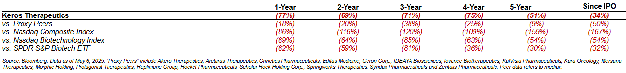 The numbers speak for themselves. Keros has generated negative total stockholder returns across every relevant timeframe since its initial public offering, underperforming its proxy peers and relevant market and biotechnology sector benchmarks.