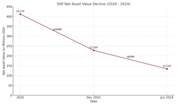 According to the Company’s own filings, the Company’s net asset value stood at $412 million in 2020. On April 13, 2023, SSP filed a Form 8-K indicating $228 million of net asset value for the period ending December 31, 2022, which resulted in the loss of an estimated $184 million in net asset value. On September 24, 2024, SSP filed a Form 8-K indicating further decline to $134 million of net asset value for the period ending June 30, 2024. This represented an additional $93 million destruction of net asset value over the 18-month period between January 1, 2023 and June 30, 2024. Now five months after their most recent NAV filing, Haddock and SSP colleagues are warning shareholders that a liquidation could yield zero value.