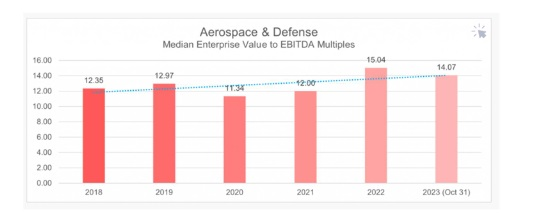 Similarly, another report from the Institute for Mergers, Acquisitons, and Alliances20 cites median Aerospace & Defense EV/EBITDA transaction multiples ranging from ~11.3x to ~15x from 2018 – 2023, although the lowest median multiples occurred during the COVID pandemic – if we exclude 2020 and 2021, the lowest median multiple was 12.3x.