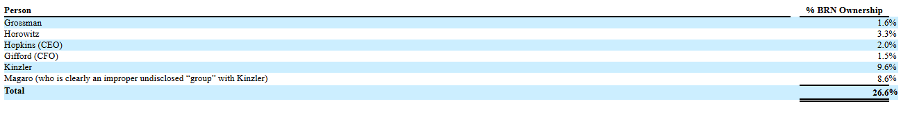 Why would any shareholder support the antics of these two lone directors or the two others they propose to elect? Grossman and Horowitz have literally pushed BRN into a going concern warning with their wasteful spending padding the pockets of Grossman’s lawyer brother at Skadden, among other law firms. They have also refused to move forward with an investigation into the Texas investment, damages that could bring the Company $10.0 - $15.0 million in recovery against Kinzler and many of the current and past directors, including Phil McPherson (the candidate chosen by Grossman and Horowitz to rejoin the Board)). Grossman and Horowitz are too busy manipulating the corporate machinery to keep their board seats rather than investigate this matter, a gross violation of their fiduciary obligations in my opinion.