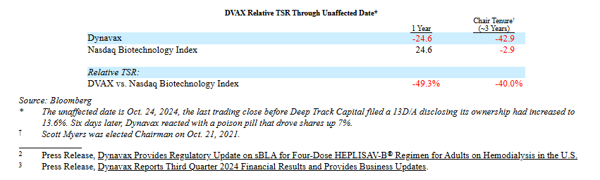 We believe the Company’s underperformance demonstrates a lack of investor confidence in its current strategy and concerns that Dynavax is going to squander its profits on a misguided acquisition.