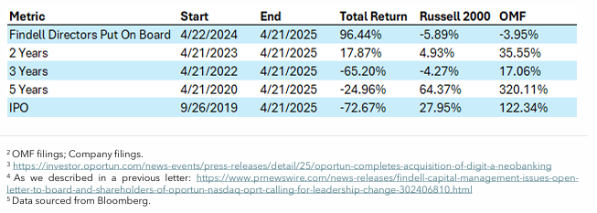 Since the appointment of Messrs. Parker and Tambor in 2024 as part of our cooperation agreement with the Company, Oportun’s total return has meaningfully improved, demonstrating the importance of proper Board oversight.⁵