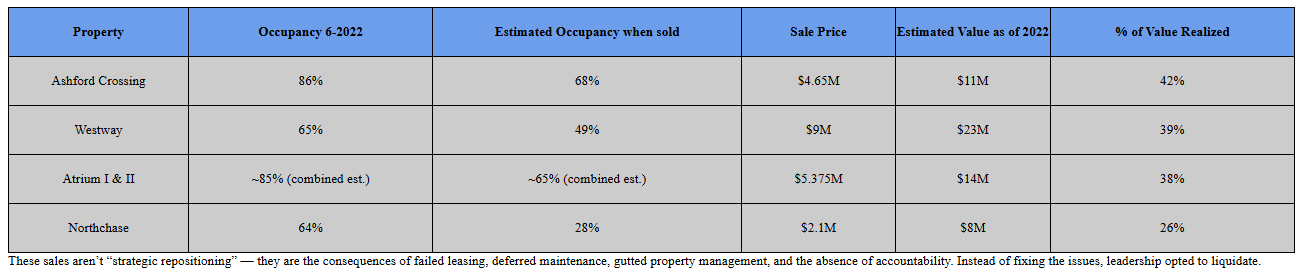 In June 2022, just two months before Al Hartman was removed as CEO (August 2022), key office properties were stabilized and generating strong rental income. But under new leadership, occupancy collapsed and the properties realized sales value often lower than what was paid 10+ years ago. These were not distressed assets; they became distressed through neglect and mismanagement.