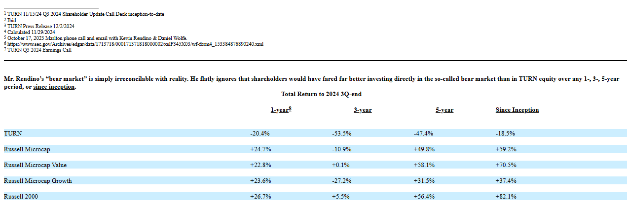 To explain the magnitude of value destruction driven by his ‘boom and bust’ investment approach, coupled with his refusal to return capital, Mr. Rendino has chosen to invent an imaginary bear market in TURN’s asset class. As recently as November 15th 2024, Mr. Rendino told shareholders “[the]bear market for our asset class has lasted far longer and driven valuations down far further than I ever would have thought possible.”7