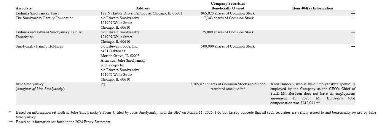1. Ludmila Smolyansky (age 75). Ludmila Smolyansky (“Mrs. Smolyansky”) does not have any substantial interest, direct or indirect, by security holdings or otherwise, in any matter to be acted upon at the Annual Meeting, other than (i) her beneficial ownership of shares of Common Stock, as summarized below, and her belief that the election of one or more of the Planned Nominees could increase the value of such shares, and (ii) any compensation she would receive in connection with her service as a director. Mrs. Smolyansky’s business address is 182 N Harbor Drive, Penthouse, Chicago, IL 60601. Mrs. Smolyansky does not have a present principal occupation; she is not employed. She has not, during the past ten years, been convicted in a criminal proceeding (excluding traffic violations or similar misdemeanors) or any other event described in Item 401(f) of Regulation S-K. She is the beneficial owner of 1,068,166 shares of Common Stock (representing approximately 7.2% of the Company’s outstanding shares of Common Stock based on 14,816,470 shares of Common Stock outstanding as of November 6, 2024, as reported by the Company on its Quarterly Report on Form 10-Q for the quarterly period ended September 30, 2024, as filed with the Securities and Exchange Commission (the “SEC”) on November 14, 2025). She does not own, of record or beneficially, any other securities of the Company. There are no securities of the Company owned by Mrs. Smolyansky of record but not beneficially, although she has disclaimed beneficial ownership of 75,000 shares of Common Stock held by the Ludmila and Edward Smolyansky Family Foundation. A record of Mrs. Smolyansky’s purchase and sale transactions during the past two years involving securities of the Company is included in the transactions listed below: