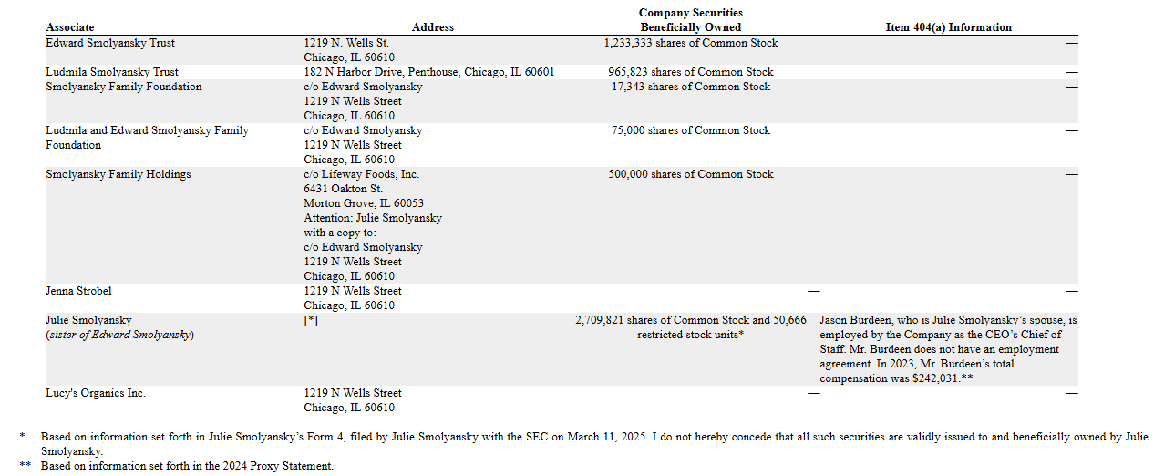 2. Edward Smolyansky (age 45). I do not have any substantial interest, direct or indirect, by security holdings or otherwise, in any matter to be acted upon at the Annual Meeting, other than (i) my beneficial ownership of shares of Common Stock, as summarized below, and my belief that the election of one or more of the Planned Nominees could increase the market value of such shares, (ii) my ownership of and officer role with Lucy’s Organics (as defined below), which could benefit, or be harmed, if I were elected to the Board, including as a result of my becoming subject to fiduciary duties as a director of the Company, and (iii) any compensation I would receive in connection with my service as a director. My business address is 1219 N Wells Street, Chicago, IL 60610. My present principal occupation is Manager of 1219 N. Wells Street Management LLC, a property management company, and Chief Executive Officer of Lucy’s Organics Inc. (“Lucy’s Organics”), which has immaterial assets and no employees, and which I founded to research potential innovations and techniques in the production of kefir, and to develop intellectual property for an aspirational brand, Pure Culture Organics. The address of each such entity is 1219 N Wells St, Chicago, IL 60610. I have not, during the past ten years, been convicted in a criminal proceeding (excluding traffic violations or similar misdemeanors) or any other event described in Item 401(f) of Regulation S-K. I am the beneficial owner of 3,179,975 shares of Common Stock (representing approximately 21.5% of the Company’s outstanding shares based on 14,816,470 shares of Common Stock outstanding as of November 6, 2024, as reported by the Company on its Quarterly Report on Form 10-Q for the quarterly period ended September 30, 2024, as filed with the SEC on November 14, 2025). I do not own, of record or beneficially, any other securities of the Company. There are no securities of the Company owned by me of record but not beneficially, although I have disclaimed beneficial ownership of 75,000 shares of Common Stock held by the Ludmila and Edward Smolyansky Family Foundation and of certain other securities of the Company except to the extent of my pecuniary interest therein. A record of my purchase and sale transactions during the past two years involving securities of the Company is set forth below: