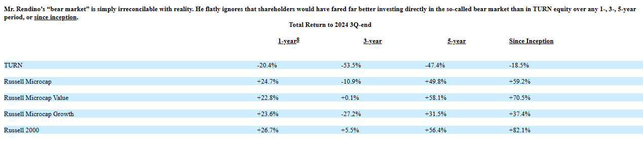 The market has had more than seven years to assess the impact of Mr. Rendino and this Board. The results are clear: absentee oversight has failed shareholders. This failure underscores the urgent need for fresh perspectives, true boardroom independence, and a clear, binding commitment to return capital to shareholders at NAV. Without these changes, TURN's persistent underperformance and widening discount to NAV are unlikely to be resolved.