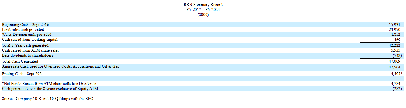 The above table clearly shows that BRN management during Kinzler’s CEO stewardship utilized the entire $15.9 million cash balance as of September 2016, plus the entire $23.97 million windfall from its Hawaii land sales (largely spurred by Covid), primarily in non-productive ways leaving BRN shareholders with essentially a Calgary oil and gas operation clearly worth far less than the $47 million of the cash that the company had generated to invest during the Kinzler tenure. Bringing the cash table forward to December 2024, BRN cash balances have declined to $1.96 million! Further, we have repeatedly highlighted our understanding that Alex Kinzler forced through a decision to make a $5.3 million plus Texas oil and gas partnership investment with virtually no due diligence. This investment has recently been written down by $2.3 million during the past two quarters alone!