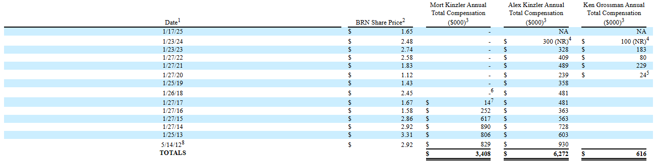 4. Since BRN has not yet filed their proxy statement disclosing the amount of total annual compensation earned by Mr. Alex Kinzler and Mr. Grossman in 2024, the amounts noted are not reported (NR) and are estimated based on compensation earned in the prior year of 2023.
